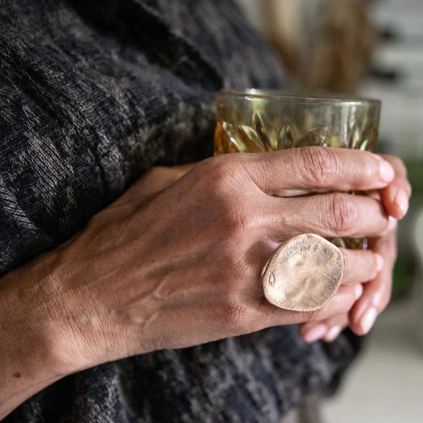 The Piastra Ring is a bold yet timeless piece, handcrafted from solid bronze using the ancient lost-wax casting method in a small atelier in Florence, Italy. Its strong, textured form is inspired by natural marine elements, giving it a raw, organic beauty that feels both ancient and modern.